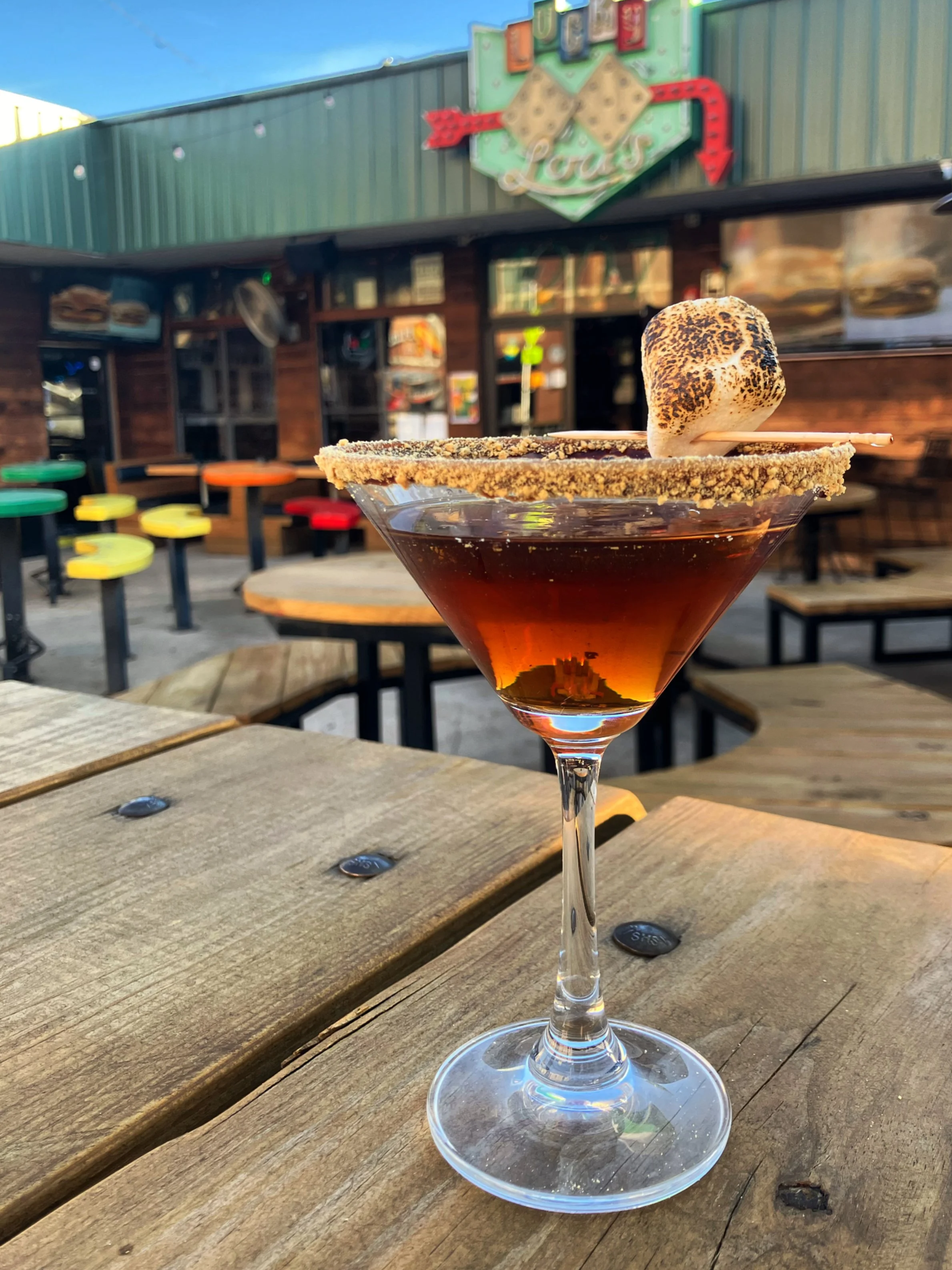 Whipped Vodka, Chocolate Liqueur, Toasted Marshmallow Syrup. Chocolate Syrup and Graham Cracker Rim with a Toasted Marshmallow